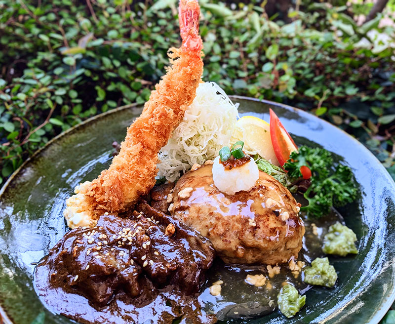ひと皿にエビフライ、ハンバーグ、牛たん煮込みの3種の合盛り! 当店で人気のメニュー、エビとハンバーグとタンシチューの和風味になります。 手づくりタルタルにゴマ味噌と和風あん、ソースも3種でごはんがすすみますよ。 わさびもアクセントです。