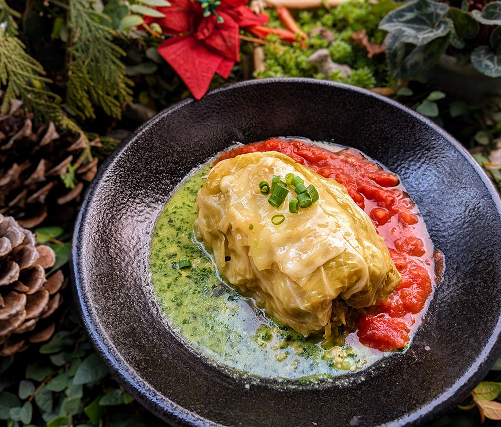 期間と数量限定でクリスマスカラーの2色ソース(魚介のトマトソースとチキンバジルソース)のロールキャベツが登場します。 12/23〜25のクリスマスコースのメインディッシュに、おすすめの一皿!