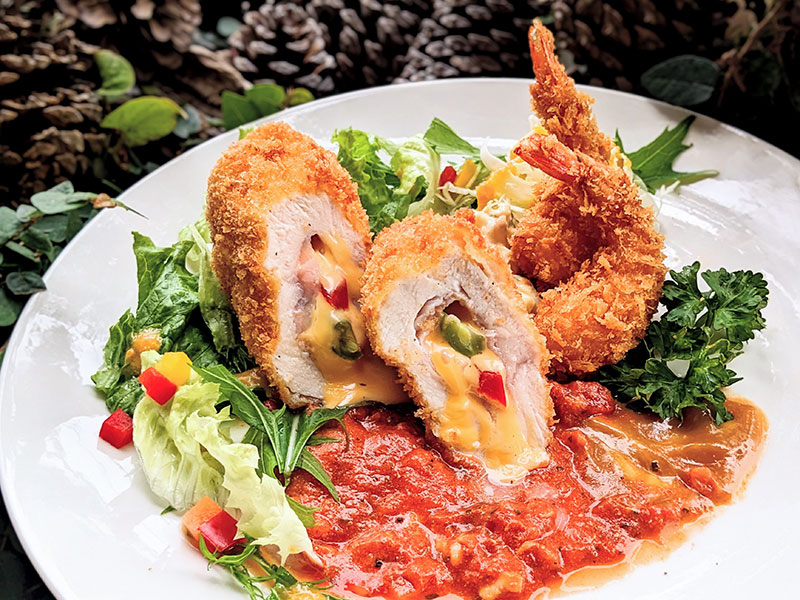 チキンのフライにチーズと生ハムが入って楽しいひと皿。ソースも3種類!
